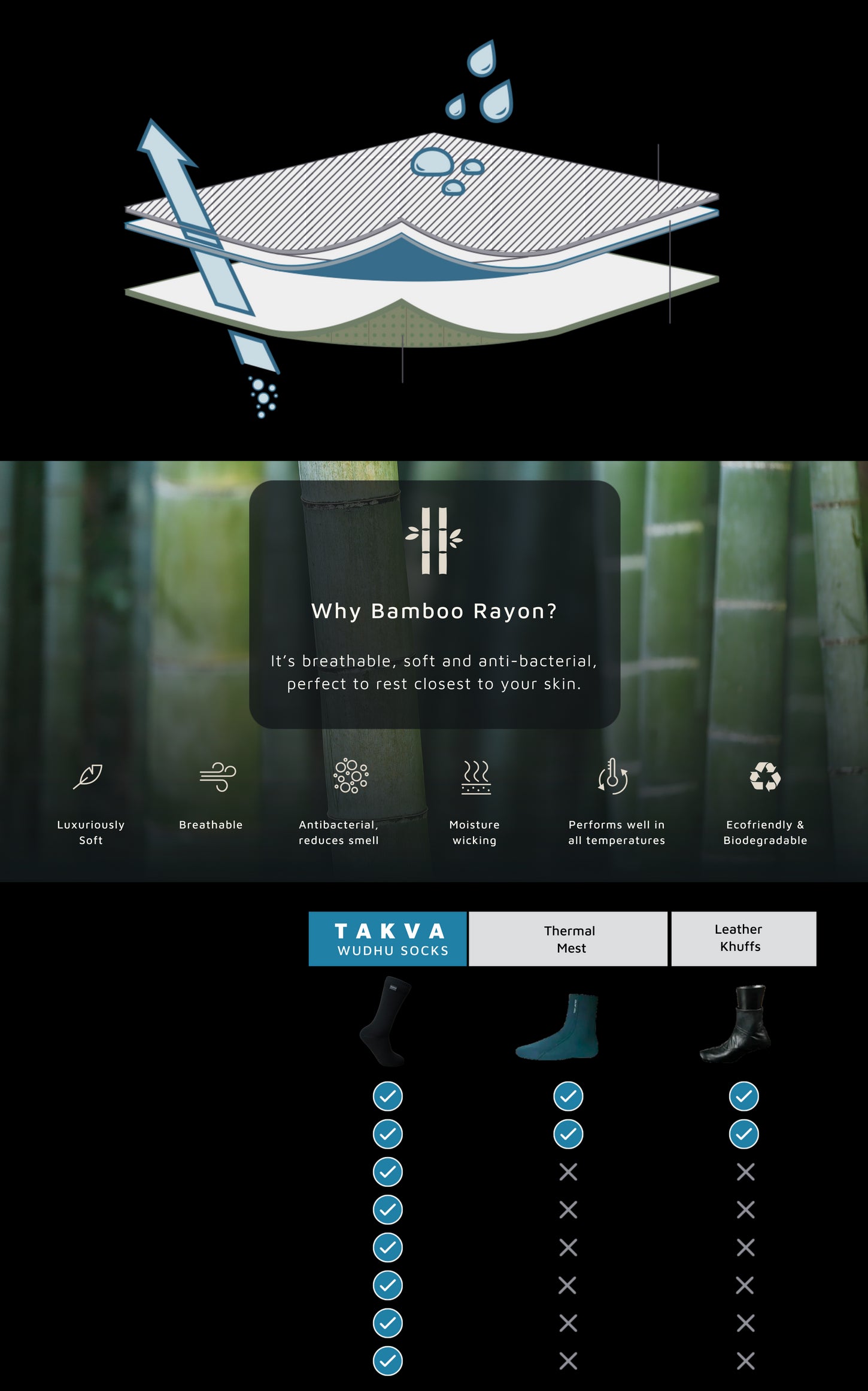 TAKVA Wudhu Socks uses a special 3-layered fabric technology that gives greater comfort and breathability to the skin. So even though our socks are 100% waterproof, they still allow moisture from the skin to escape.And because we pride ourselves in providing quality in comfort and use, we chose Bamboo Rayon for the innermost layer closest to the skin, because its softness, breathability and moisture-wicking goes unrivalled.